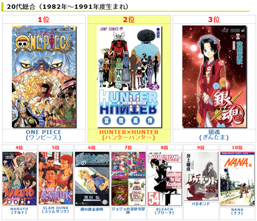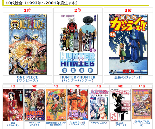 以一次賣整套漫畫為主打的日本網站「全巻讀破.COM」,在網站中舉行了對於各年齡層的喜愛漫畫進行了『人氣漫畫名次』的排行榜。本排行榜的統計時間從2011年4月1日開始到2012年3月31日,期間長達一年。